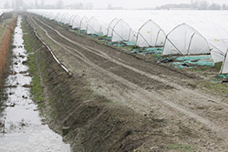 Piogge intense e periodi siccitosi si alternano infatti con frequenza repentina, per cui le 2 facce della Bonifica (scolo e irrigazione) si alternano in un equilibrio sempre più complesso; anche le esigenze sono diventate via via molteplici: da diversi anni, in deroga alla stagione irrigua ordinaria, viene tenuta parzialmente invasata la rete dei canali anche in inverno per garantire l’irrigazione anticipata anche alle primizie ed a tutti i prodotti in serra. Il servizio antibrina prevede l’invaso parziale anticipato della rete dei canali e quindi l’attivazione di al-cuni impianti pluvirrigui, che distribuiscono acqua in pressione attraverso tubazioni sotterranee. La tecnica si basa sul principio di proteggere i fiori e le gemme dall’eccessivo abbassamento della temperatura, mantenen-doli a livelli non inferiori a -2 gradi: in pratica, quando l’acqua spruzzata sopra la pianta gela, questa rilascia calore e ciò permette di creare una coltre protettiva termica, che impedisce o riduce fortemente i danni provo-cati dal gelo.