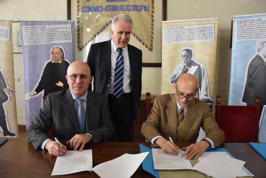Anticipando 3 analoghi, importanti momenti previsti nell’ambito della prossima Conferenza Nazionale “Acqua, motore della green economy”, ANBI Toscana ha siglato a Firenze un Protocollo d’Intesa con l’Accademia dei Georgofili per sviluppare il reciproco patrimonio culturale, acquisendo nuove conoscenze tecnico-scientifiche: in primo piano viene posta la formazione dei tecnici e delle giovani generazioni, ma grande importanza viene data anche all’innovazione nel settore dell’agricoltura, delle foreste e della regimazione idraulica. Per dare la massima diffusione a tutte le iniziative di comune interesse, i due enti collaboreranno per organizzare congiuntamente seminari e gruppi di studio. Esiste un legame antico tra Consorzi di bonifica e Accademia dei Georgofili, rafforzato adesso da una convenzione, che ha durata triennale, rinnovabile e si allinea alla nuova programmazione europea 2014-2020 in materia di sviluppo rurale.