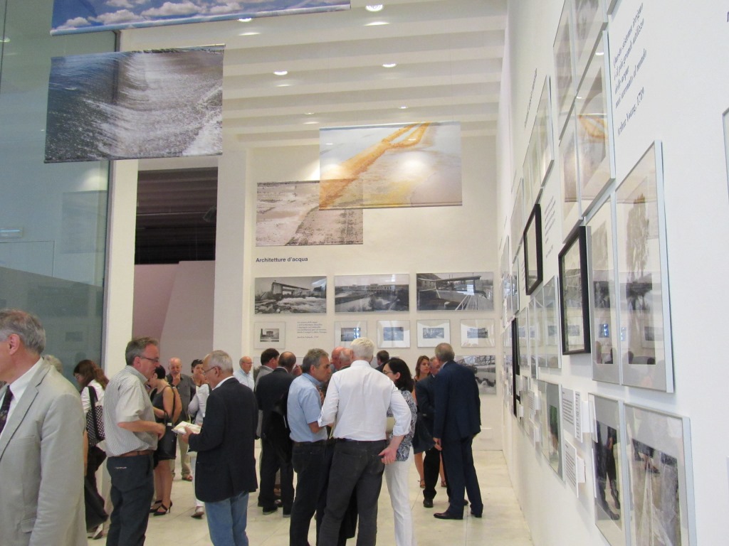 Alla fine del convegno è stata inaugurata la mostra, aperta fino al 31 Luglio p.v. e che vede la presenza delle opere di 7 artisti; in particolare: Gabriele Basilico ha rilevato i grandi impianti di bonifica e di irrigazione, vere e proprie "architetture d'acqua", che hanno messo in sicurezza e reso fertile "quell'immenso deposito di fatiche", che è la pianura lombarda; Gianni Berengo Gardin ha percorso i Navigli milanesi, lodigiani e cremonesi; Vittore Fossati ha immortalato i fontanili, che impreziosiscono il paesaggio e danno vita a molte specie animali e vegetali; Francesco Radino si è addentrato nei musei e negli ecomusei, che raccontano la storia della bonifica e del lavoro dell'uomo; Carlo Meazza ha guardato ai laghi e ai fiumi che, regolati e gestiti, hanno offerto una risorsa fondamentale per lo sviluppo dell'economia e della società; Mimmo Jodice si è soffermato su quei monumenti (abbazie, castelli, cascine, ville di delizia), che assurgono ad icone del rapporto acqua-arte-società; Claudio Sabatino, infine, ha percorso la pianura, cogliendo quegli elementi (specchianti adacquature di risaie, dritti filari di alberi, colorate campiture di mais e di grano...), che compongono i modi dell'abitare, del vivere e del produrre dell'uomo della Bassa Lombarda.