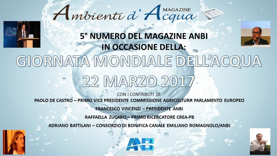 In concomitanza con la Giornata Mondiale dell’Acqua, l’Associazione Nazionale Consorzi Gestione Tutela Territorio ed Acque Irrigue (ANBI) ha messo in rete il nuovo numero del suo magazine on-line “Ambienti d’Acqua”, incentrato sul futuro della risorsa idrica in un’ottica comunitaria ed internazionale.