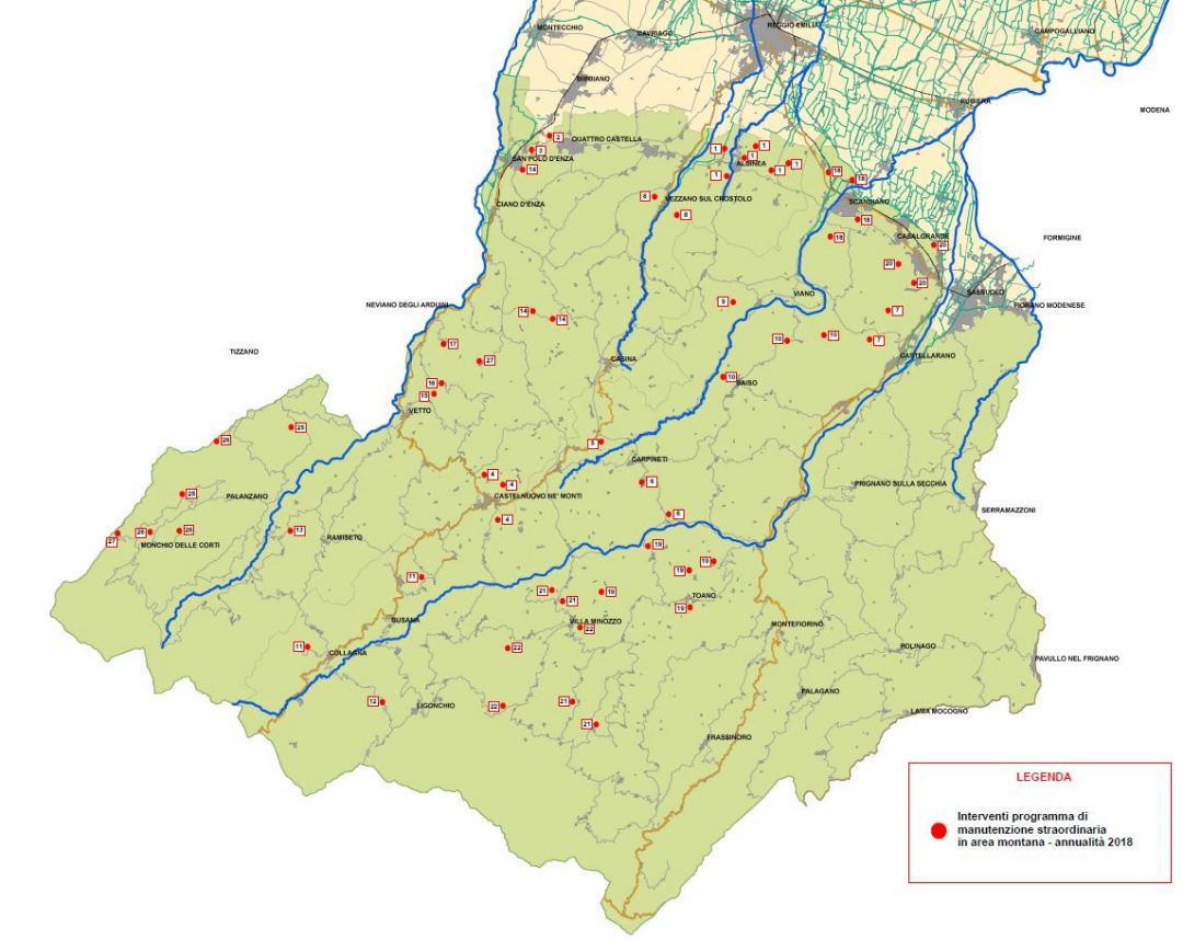 Gli interventi individuati, dopo una fase di studio e monitoraggio delle zone più colpite in collaborazione con gli uffici tecnici dei Comuni interessati ,riguarderanno per lo più: ripristino movimenti franosi, regimazione idrauliche, consolidamento versanti, sistemazione strade di bonifica, messa in sicurezza scarpate, manutenzioni reticolo rii minori, pulizia alvei, sistemazione e rafforzamento ponti sedi stradali pubbliche; interesseranno i comuni di Castelnuovo Monti, Carpineti, Castellarano, Vezzano sul Crostolo, Baiso, Viano, Ventasso, Veto, Canossa, Scandiano, Toano, Casalgrande, Villa Minozzo, Casina, Palanzano, Tizzano.