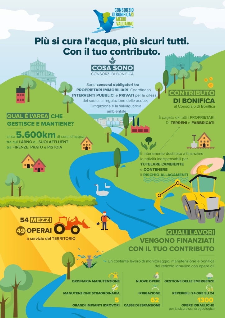 “Più si cura l’acqua, più sicuri tutti. Con il contributo di bonifica”: è questo il concetto semplice, ma chiaro, che accompagna la richiesta del Consorzio di bonifica 3 Medio Valdarno (con sede a Firenze), per il lavoro contro il rischio idrogeologico sui fiumi di Firenze, Pistoia, Prato, Empoli ed il Nord di Siena; infatti, sono in stampa e in arrivo nei prossimi giorni ad oltre cinquecentomila proprietari di immobili, società ed enti, gli avvisi di pagamento, relativi al contributo di bonifica 2017 per la manutenzione delle opere idrauliche e dei corsi d’acqua, che attraversano le città di Firenze, Pistoia, Prato, Empoli e le campagne della Valdelsa, del Mugello, della Valdisieve, del Chianti, delle vallate dell’Ombrone Pistoiese e dei comuni a Nord di Siena.