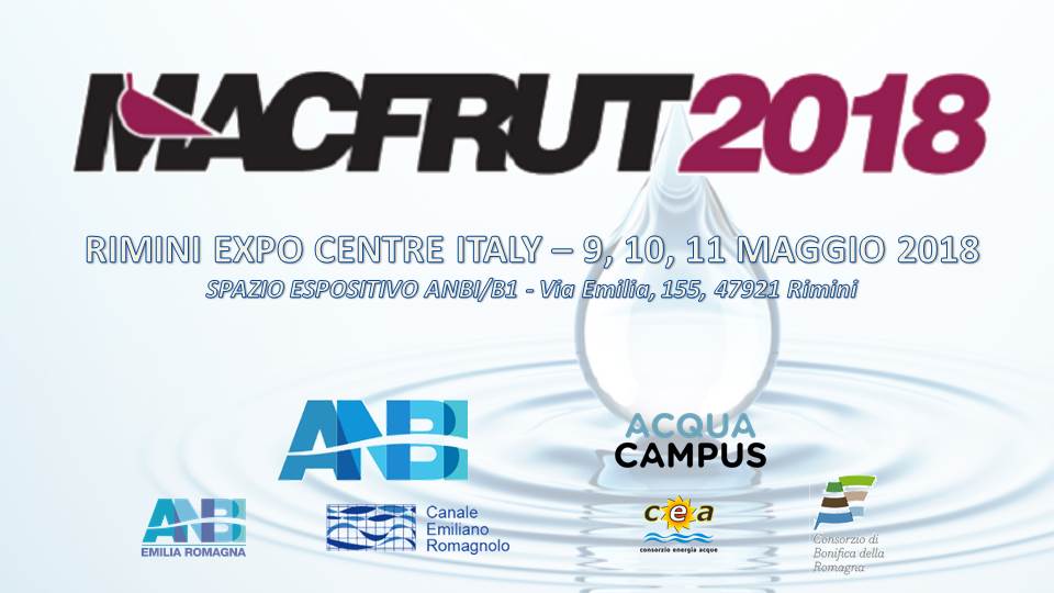 Dal 9 all’11 Maggio p.v., in occasione di MACFRUT negli spazi del Rimini Expo Centre, ANBI, Consorzio di 2° grado C.E.R. – Canale Emiliano Romagnolo (con sede a Bologna), ANBI Emilia Romagna, C.E.A. (Consorzio Energia Acque) e Consorzio di bonifica Romagna (con sede a Cesena, FC) allestiranno, per la prima volta, l’area dimostrativa “ACQUA CAMPUS Field Solution”, dove saranno presentate le più moderne soluzioni nel campo dell’irrigazione, capaci di ottimizzare l’utilizzo dell’acqua in agricoltura, abbinando obbiettivi produttivi ed ambientali.