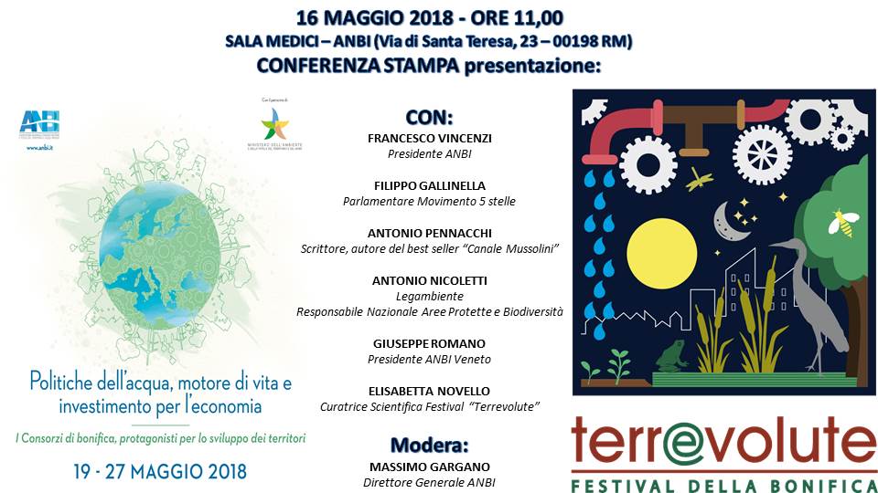 Mercoledì 16 Maggio p.v. alle ore 11.00, in sede ANBI a Roma (via Santa Teresa 23), si terrà la conferenza stampa di presentazione dell’ormai tradizionale Settimana Nazionale della Bonifica e dell’Irrigazione; interverrà, accanto ai vertici ANBI ed a qualificati rappresentanti del Parlamento e del territorio, un testimonial d’eccezione: lo scrittore, Antonio Pennacchi, autore del best seller “Canale Mussolini”. Non sarà, però, l’unica sorpresa dell’edizione 2018 della “Settimana”, in calendario dal 19 al 27 Maggio p.v. attorno al tema “Politiche dell’acqua, motore di vita ed investimento per l’economia. I Consorzi di bonifica per lo sviluppo dei territori”: accanto alle consuete, quanto frequentate aperture straordinarie delle “cattedrali dell’acqua”, si terrà, infatti, il 1° Festival della Bonifica con un sorprendente cartellone di appuntamenti, che abbineranno scienza, spettacolo e cultura del territorio, presentando anche alcune “prime” nazionali; per iniziativa di ANBI Veneto ed Università di Padova, ne sarà sede San Donà di Piave, in provincia di Venezia, dove nacque, nel 1922, la moderna Bonifica e dove ha sede il Consorzio di bonifica Veneto Orientale.