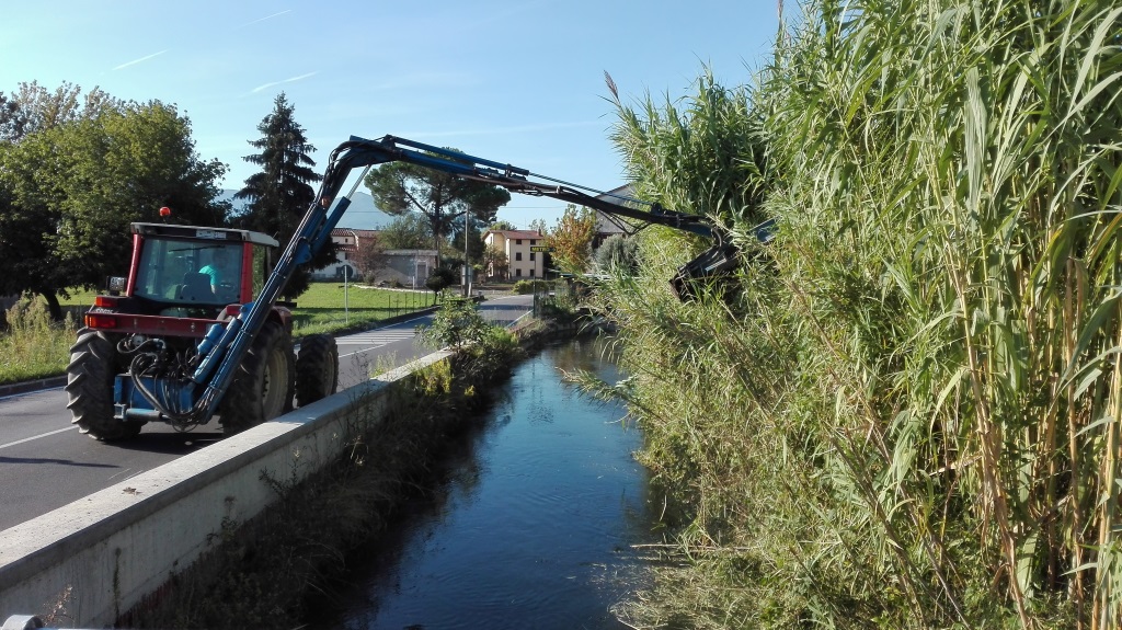 Il taglio dell’erba, come ogni anno previsto da Aprile ad Ottobre, serve a sgombrare le aree fluviali artificiali e, in ambito urbano, per il controllo della stabilità arginale, eventuali sistemazioni ma anche per la fruibilità ed il decoro fluviale. L’esecuzione di queste lavorazioni è eseguita in parte da mezzi ed operatori specializzati dell’ente consortile, in parte affidata all’esterno mediante specifici appalti, poiché gli sfalci sono solitamente previsti quasi in contemporanea o nel giro delle stesse settimane su tutte le aree del comprensorio.