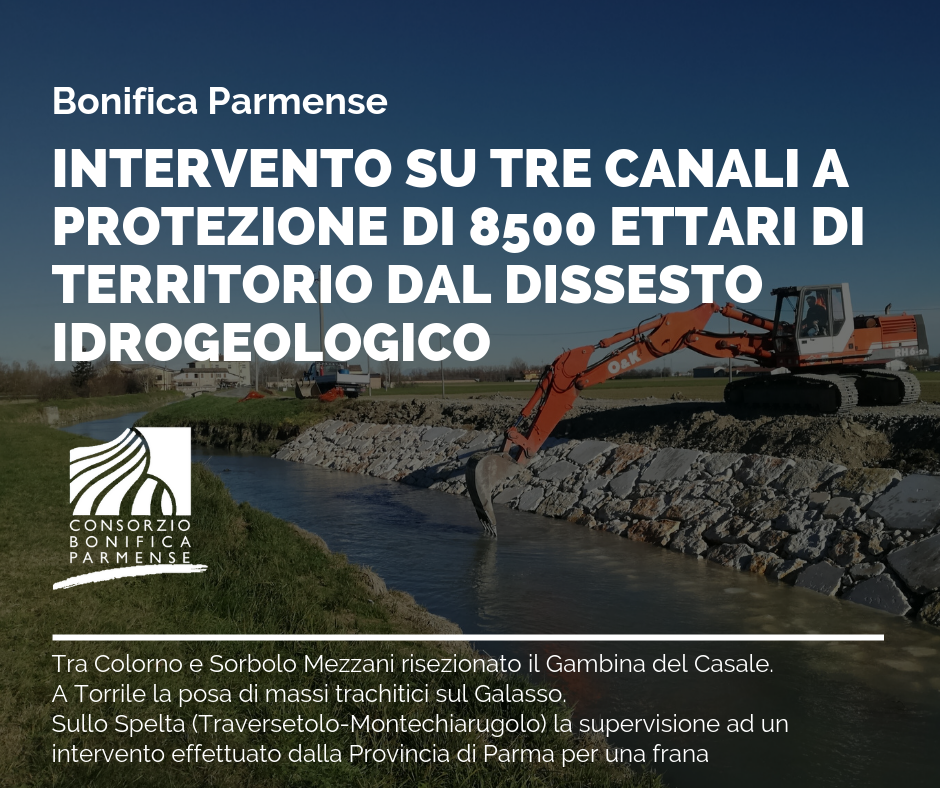 Il primo intervento riguarda il canale Galasso, nel comune di Torrile: in un tratto di 80 metri sull’argine destro è stata operata la posa di massi trachitici sia sul fondo che sulla sponda; il corso d’acqua, che sfocia nel torrente Parma all’altezza di Colorno, serve un comprensorio di 2009 ettari. Il secondo lavoro è il risezionamento del canale Gambina del Casale, sito tra i comuni di Colorno e Sorbolo Mezzani: un intervento su una lunghezza di ben 5650 metri, con pulizia dell’alveo, che pone in sicurezza 4000 ettari.