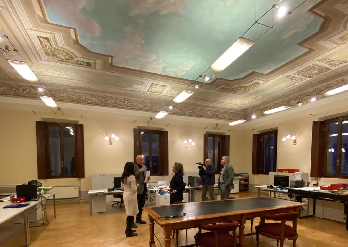 La sala, che un tempo ospitava le riunioni del Consiglio dei Delegati ed ubicata nella palazzina stile liberty nel centro cittadino di Cremona (attualmente in uso come ufficio tecnico del Consorzio di bonifica Terre dei Gonzaga in Destra Po), presenta un soffitto interamente decorato. Il soprintendente, Gabriele Barucca, in visita al termine del restauro, ha evidenziato che si tratta di un chiaro omaggio al cielo, dipinto da Mantegna nella Camera Picta del Castello di San Giorgio nella seconda metà del XV° secolo: Le decorazioni risalgono ai primi del ‘900, periodo in cui fu costruito l’edificio, sede del consorzio, progettato da Pietro Ploner nel 1912. Il soffitto necessitava di restauro e l’ente consortile si è attivato per salvaguardare questa importante traccia artistica. Il recupero si è reso necessario per non compromettere ulteriormente lo stato di conservazione del soffitto. Le decorazioni presentavano crepe, porzioni di intonaco staccato, infiltrazioni di umidità, efflorescenze saline e ridipinture poco accurate risalenti al 1949. L’ente consorziale ha anche intrapreso ricerche per conoscere l’identità dell’artista che ha realizzato le decorazioni”. Il “Terre dei Gonzaga in Destra Po” si rende disponibile per visite della sala con gruppi organizzati di turisti, che volessero apprezzare l’opera e la stessa palazzina, al cui interno si trova una scala a giorno in marmo botticino con balaustra in ferro battuto di rara eleganza, oltre ad una scenografica biblioteca fornita di boiserie in legno con parquet galleggiante a spina pesce e soffittatura a cassettoni.