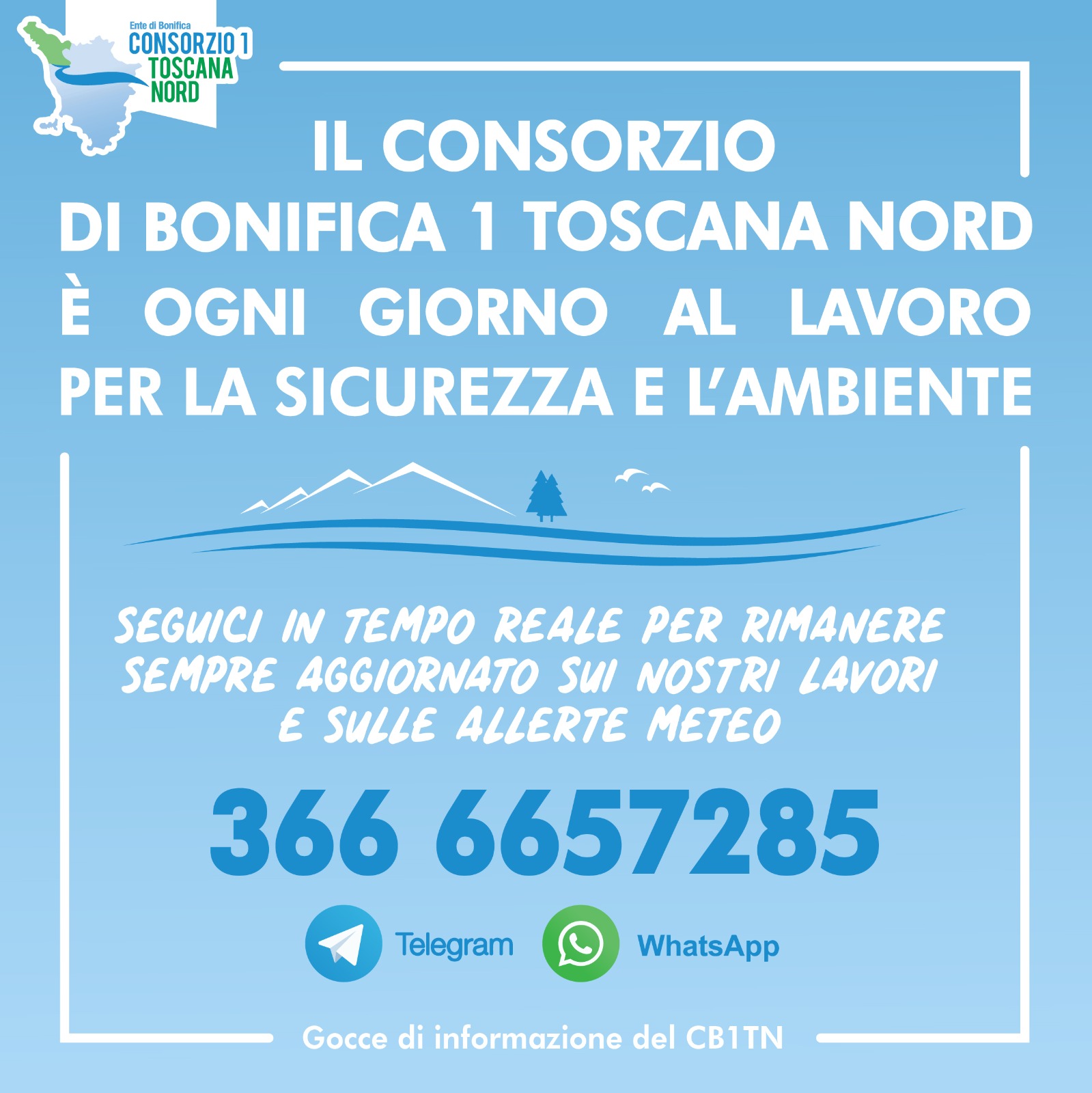 Le notizie sui lavori realizzati sui corsi d’acqua e sulle allerte meteo interessanti il comprensorio del Consorzio di bonifica 1 Toscana Nord (con sedea Viareggio, in provincia di Lucca)? Adesso, per tutti i cittadini, arrivano comodamente e gratuitamente sui telefonini, tramite la messaggistica istantanea di Whatsapp e Telegram.