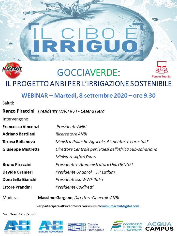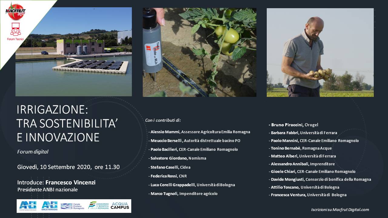 Si tornerà on-line giovedì 10 Settembre, alle ore 11.30, per il webinar “Irrigazione tra sostenibilità ed innovazione”, organizzato in collaborazione con ANBI ER, Consorzio di 2° grado C.E.R. – Canale Emiliano Romagnolo (con sede a Bologna) e Consorzio di bonifica Romagna (con sede a Ravenna) sulla piattaforma di “Macfrut Digital 2020”; tra gli altri sono previsti i contributi di Alessio Mammi, Assessore Agricoltura Regione Emilia Romagna; Meuccio Berselli, Segretario Generale Autorità Distrettuale Bacino Po, nonché qualificati rappresentanti di primarie realtà quali le Università Ferrara e Bologna, gli istituti di ricerca Nomisma e C.N.R, la società Romagna Acque.