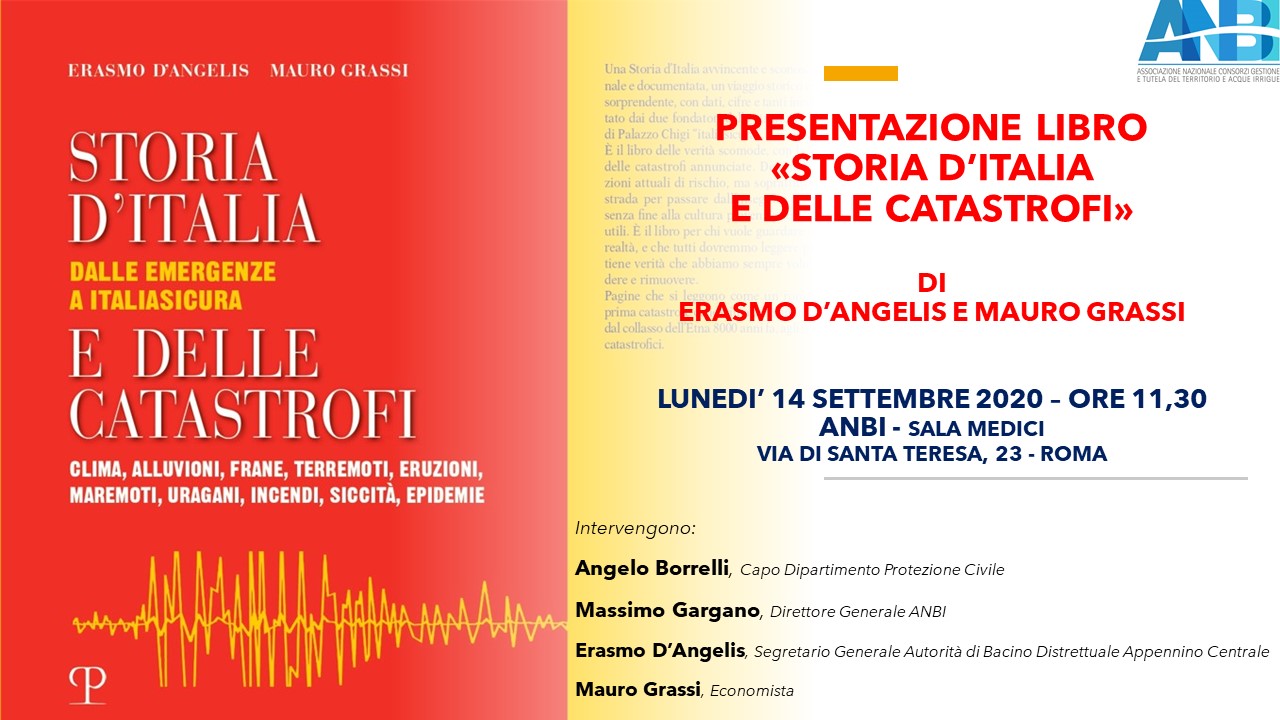 Saranno il Capo Dipartimento Protezione Civile, Angelo Borrelli ed il Direttore Generale ANBI, Massimo Gargano, a presentare ai media, lunedì 13 Settembre p.v., il libro “Storia d’Italia e delle catastrofi”, scritto da Erasmo D’Angelis, Segretario Generale dell’Autorità Distrettuale del Bacino Appennino Centrale e dall’economista, Mauro Grassi. L’appuntamento ,presenti gli autori, sarà alle ore 11.30 in sede ANBI, a Roma.
