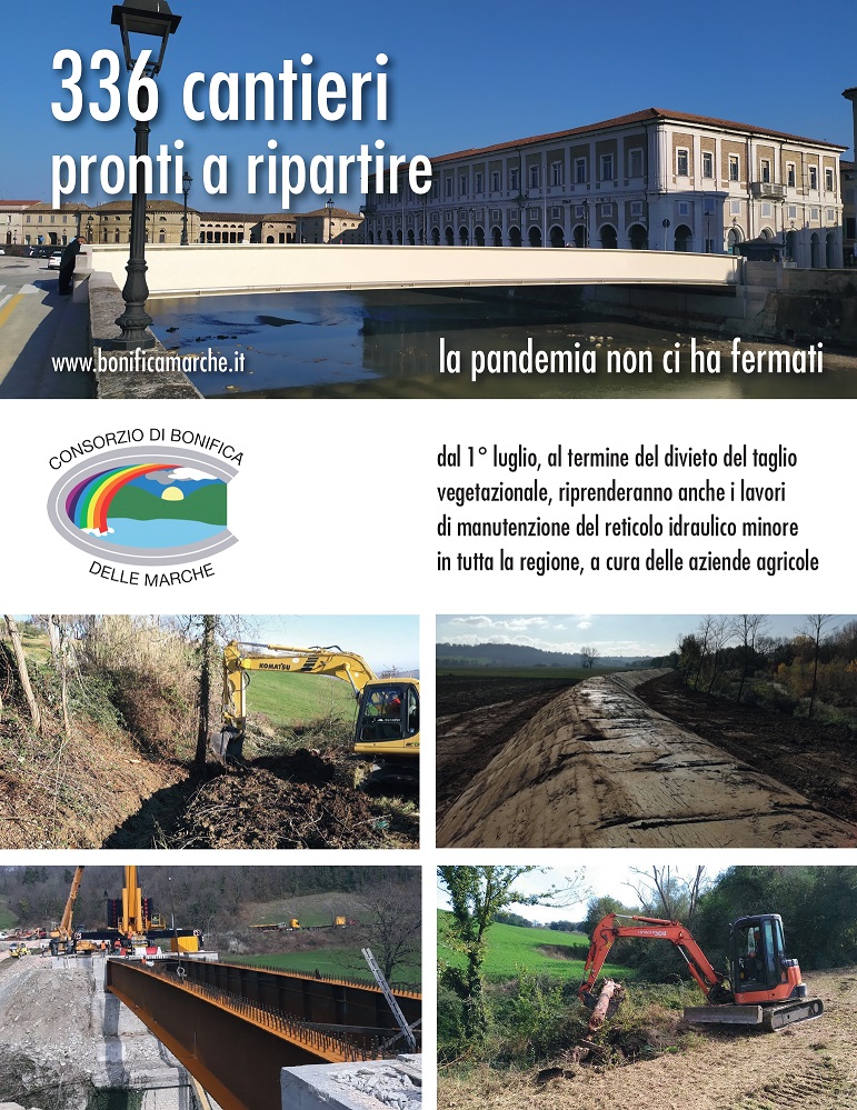Il Consorzio di bonifica Marche (con sede a Pesaro) ha annunciato la ripresa degli interventi di manutenzione sul reticolo idrografico minore e sulle acque demaniali: dal 1° Luglio (al termine del divieto del taglio vegetazionale per esigenze di tutela dell’avifauna) ripartiranno i lavori per un totale di 336 cantieri previsti in tutti e 4 i comprensori della regione (Foglia-Metauro-Cesano, Misa-Esino, Musone-Potenza-Chienti, Tenna-Aso-Tronto).