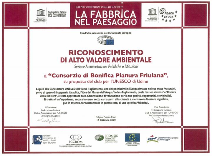 Per questo, assume ulteriore rilevanza, la menzione speciale attribuita dall’Unesco al Consorzio di bonifica Pianura Friulana (con sede a Udine) che, nell’ambito del concorso internazionale “La Fabbrica nel Paesaggio”, ha presentato l’idea di costituire un Museo dell’Acqua/Ledra-Tagliamento, quale “museo vivente” e “riserva della biosfera”, progetto particolarmente apprezzato dalla commissione di valutazione per qualità, opportunità ed originalità. Il fiume Tagliamento è infatti considerato l'unico dell' arco alpino a conservare l'originaria morfologia, che ne fa un originale ecosistema di straordinario pregio ambientale. Il progetto è un ulteriore tassello dell’offerta di “musei dell’acqua”, creata dai Consorzi di bonifica ed irrigazione e già meta di tendenza per quel turismo “slow”, che sta riscoprendo il grande patrimonio rappresentato dalla rete idraulica del Paese.