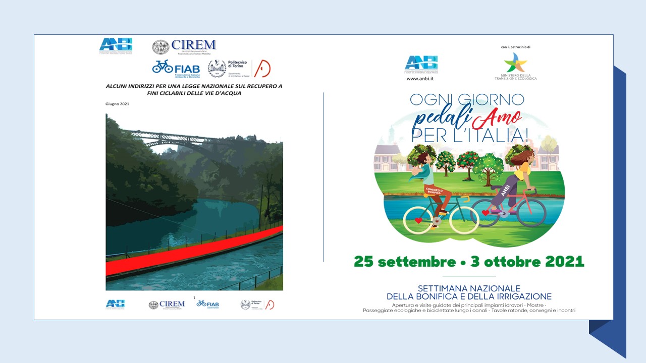 In occasione della Settimana Nazionale della Bonifica e dell’Irrigazione è stato ufficialmente presentato il documento “Indirizzi per una legge nazionale sul recupero a fini ciclabili delle vie d'acqua”, realizzato da FIAB (Federazione Italiana Ambiente Bicicletta), ANBI (Associazione Nazionale Consorzi Gestione Tutela Territorio ed Acque Irrigue), CIREM (Centro Interuniversitario Ricerche Economiche e Mobilità - Università Cagliari) e Politecnico Torino (Dipartimento Architettura e Design).