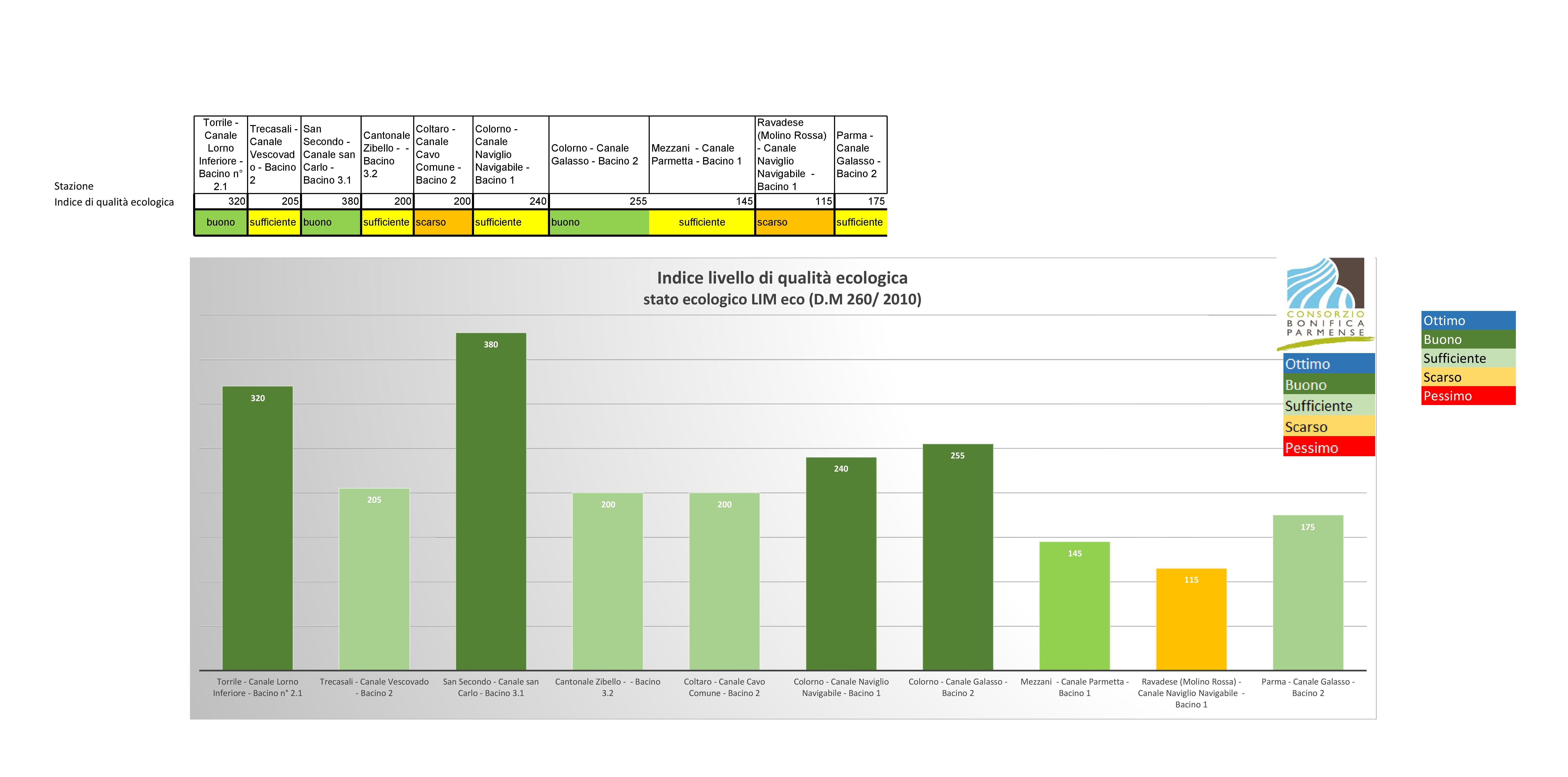 Ad oggi la campagna di monitoraggio secondo la più classica e riconosciuta “tabella Giardini” viene realizzata controllando 51 parametri indicatori, rappresentativi della qualità ecologica, della qualità per l’uso irriguo e dell’idoneità per la vita dei pesci. Il risultato delle campagne di misurazione, raccolte in diversi rapporti annuali, è decisamente positivo: non solo non ci sono significativi superamenti dei limiti degli agenti inquinanti, ma anche la tendenza statistica non mostra un aumento sensibile di questi valori. Gli inquinanti industriali e chimici, i metalli pesanti e pesticidi hanno livelli di gran lunga inferiori ai limiti di legge.