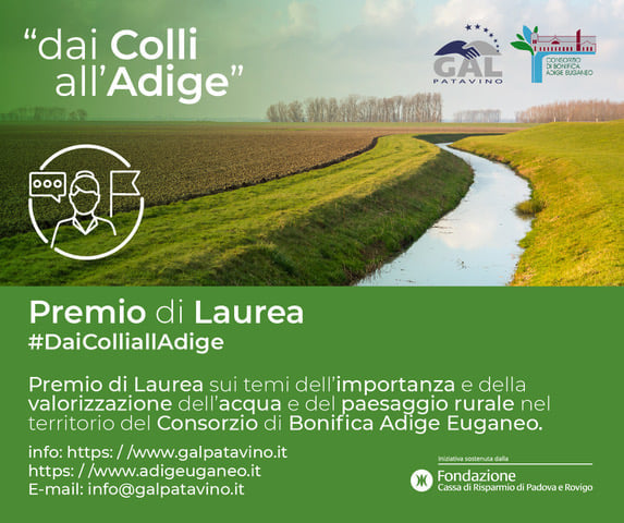 Il Consorzio di bonifica Adige Euganeo (con sede ad Este, in provincia di Padova) ed il G.A.L. (Gruppo Azione Locale) Patavino, con il sostegno di Fondazione Cassa di Risparmio di Padova e Rovigo, promuovono un premio di laurea “Dai Colli all’Adige”, dedicato a giovani studenti universitari, che prevedono di laurearsi entro il 2022.