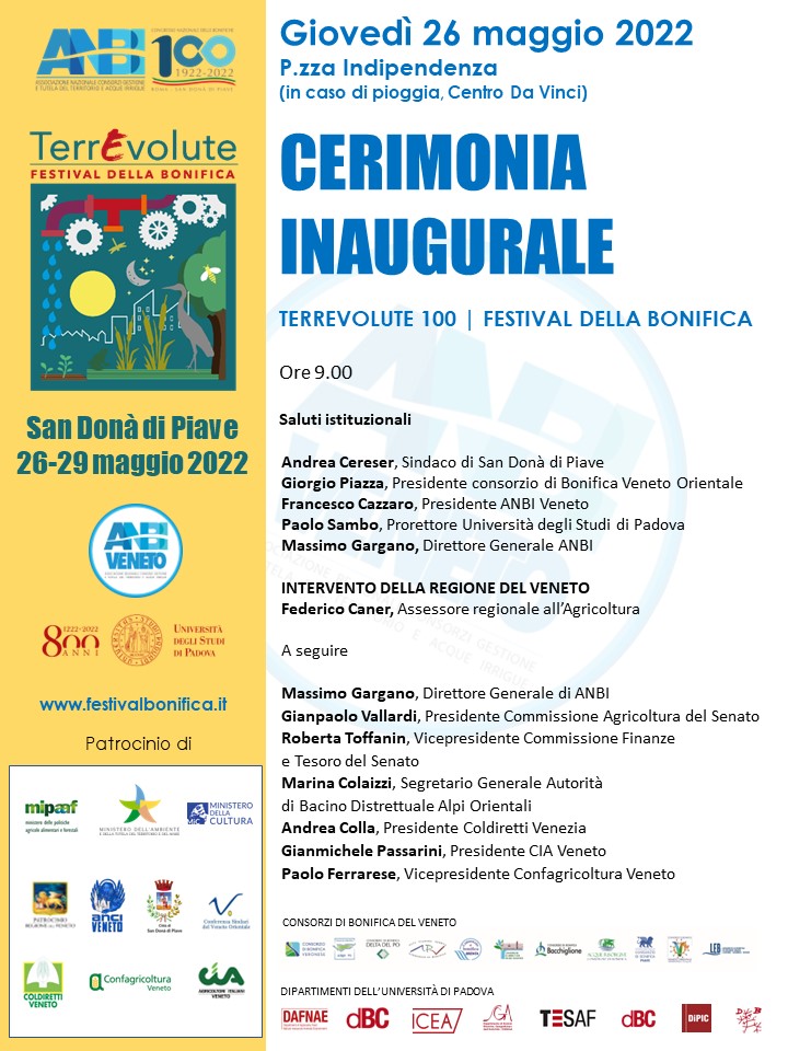 ANBI, ANBI Veneto ed Università degli Studi di Padova promuovono, dal 26 al 29 Maggio p.v. a San Donà di Piave, “Terrevolute 100 – Festival della Bonifica”, 4 giorni di incontri, convegni, spettacoli, concerti, visite guidate e mostre, dedicati al rapporto tra uomo, acqua e territorio.