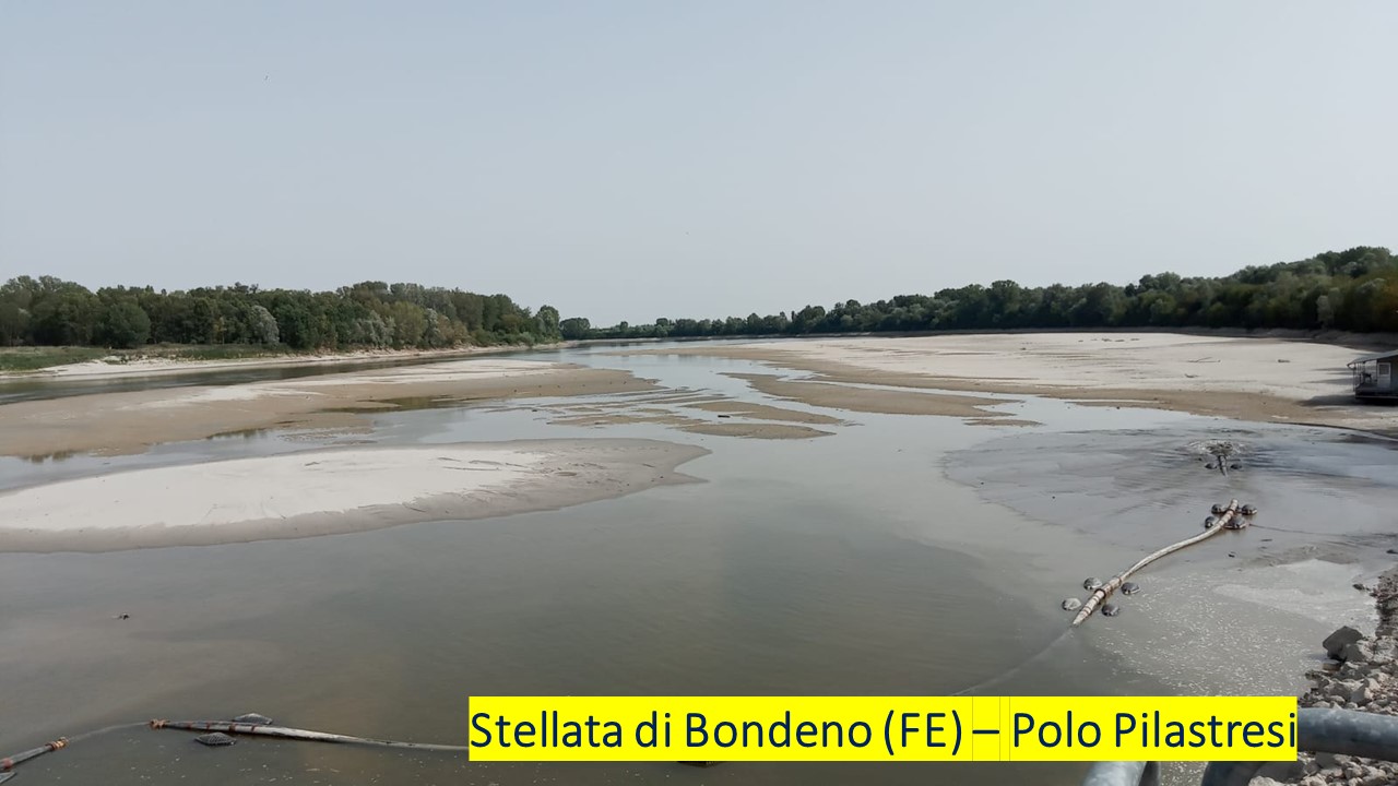 Nella speranza degli auspicati apporti pluviali da monte, la portata del fiume Po è arrivata vicino alla drammatica soglia psicologica dei 100 metri cubi al secondo al rilevamento ferrarese di Pontelagoscuro, che ne decreterebbe la fine dell’immagine di “grande fiume” con tutte le conseguenze soprattutto di carattere ambientale, che ne stanno derivando; basti pensare che il record di portata minima mensile di Luglio (2006) era stata finora di 237 metri cubi al secondo (mc,/sec.), mentre quest’anno ci si attesterà presumibilmente al di sotto di mc./sec. 170! Contestualmente la risalita del cuneo salino sfiora i quaranta chilometri dalla foce del Po di Goro durante l’alta marea; a renderlo noto è l’Osservatorio ANBI Risorse Idriche, che segnala come il fenomeno interessi i tratti terminali della gran parte dei fiumi settentrionali (ultima arrivata, la Livenza in Veneto), intaccando i prelievi ad uso potabile.