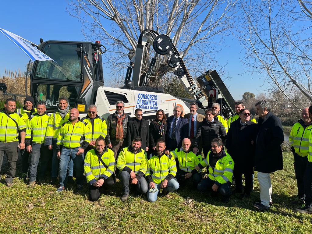 Presso la sede consortile di Casalpalocco è stata consegnata la prima macchina specifica per la manutenzione dei corsi d’acqua, dotata di trasmissione totalmente idrostatica e di specifici pneumatici ad alta galleggiabilità. Questo specifico modello da 12 metri è già presente in circa sessanta Consorzi di bonifica italiani per un totale di oltre duecento unità complessive.