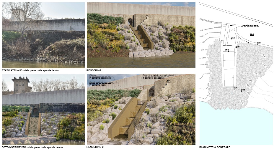 Si procederà per fasi: dapprima la realizzazione di una rampa provvisoria per l’accesso dei mezzi al fiume, quindi la gestione della vegetazione non compatibile con la nuova sistemazione, poi la realizzazione della scogliera e della struttura a gradoni, secondo una soluzione concordata con la Soprintendenza e compatibile con il pregio paesaggistico dell’area.