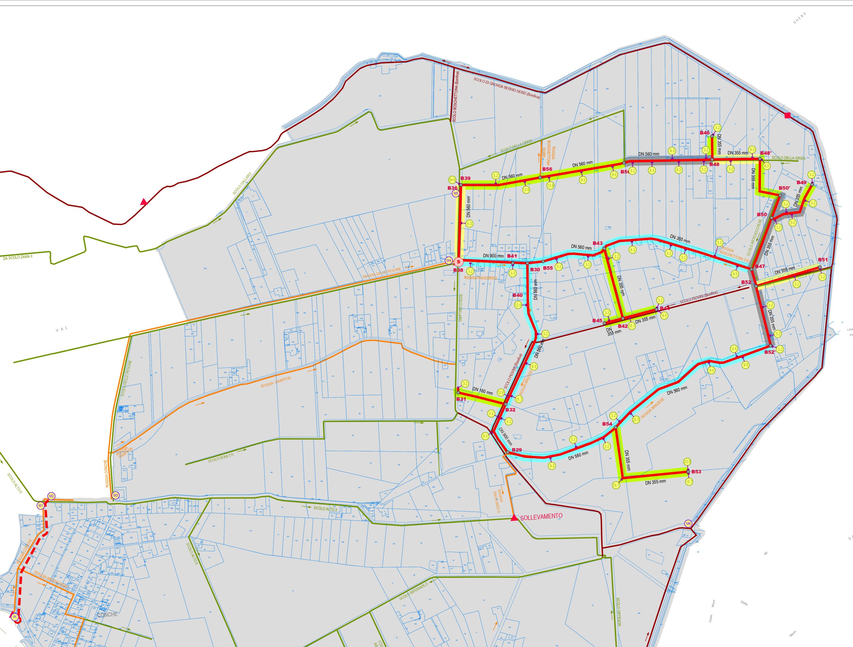 L’acqua derivata dal canale Novissimo raggiunge la parte Nordest del bacino Bernio attraverso lo scolo Pescine da dove sarà immessa nella nuova rete di distribuzione, mantenuta in pressione attraverso un impianto di pompaggio, costituito da 3 pompe, ciascuna con una portata di 250 litri al secondo.