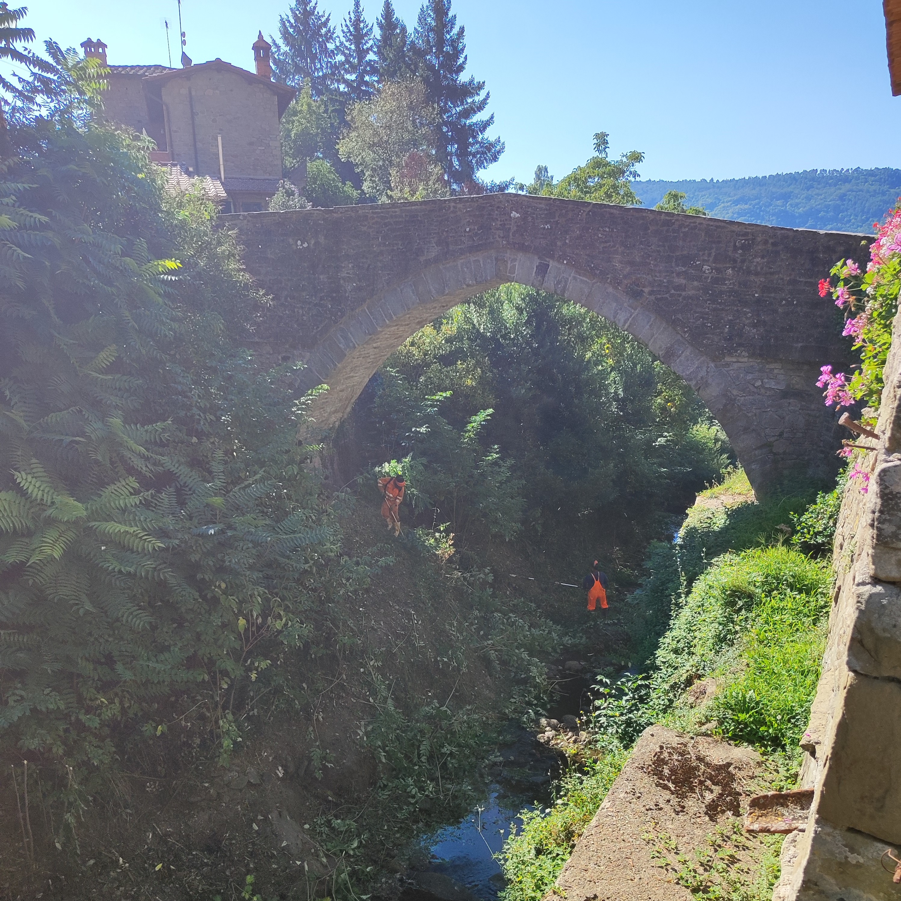 Come spesso accade, l’intervento di sfalcio, nato per mitigare il rischio idraulico contribuisce a migliorare l’ambiente ed a valorizzare gli elementi caratteristici del territorio: in questo caso lo storico ponte, sede della tradizionale Festa del Contrabbandiere, evento che unisce Valtiberina e Casentino attraverso la rievocazione storica dello scambio del tabacco della Valtiberina con la polvere nera di Chitignano, cioè la polvere da sparo, ricavata dalle polveriere che in passato erano posizionate lungo il torrente Rio, le cui acque venivano utilizzate per raffreddare le lavorazioni con i mazzapicchi (appositi strumenti con asta) ed evitare così il rischio di esplosioni.
