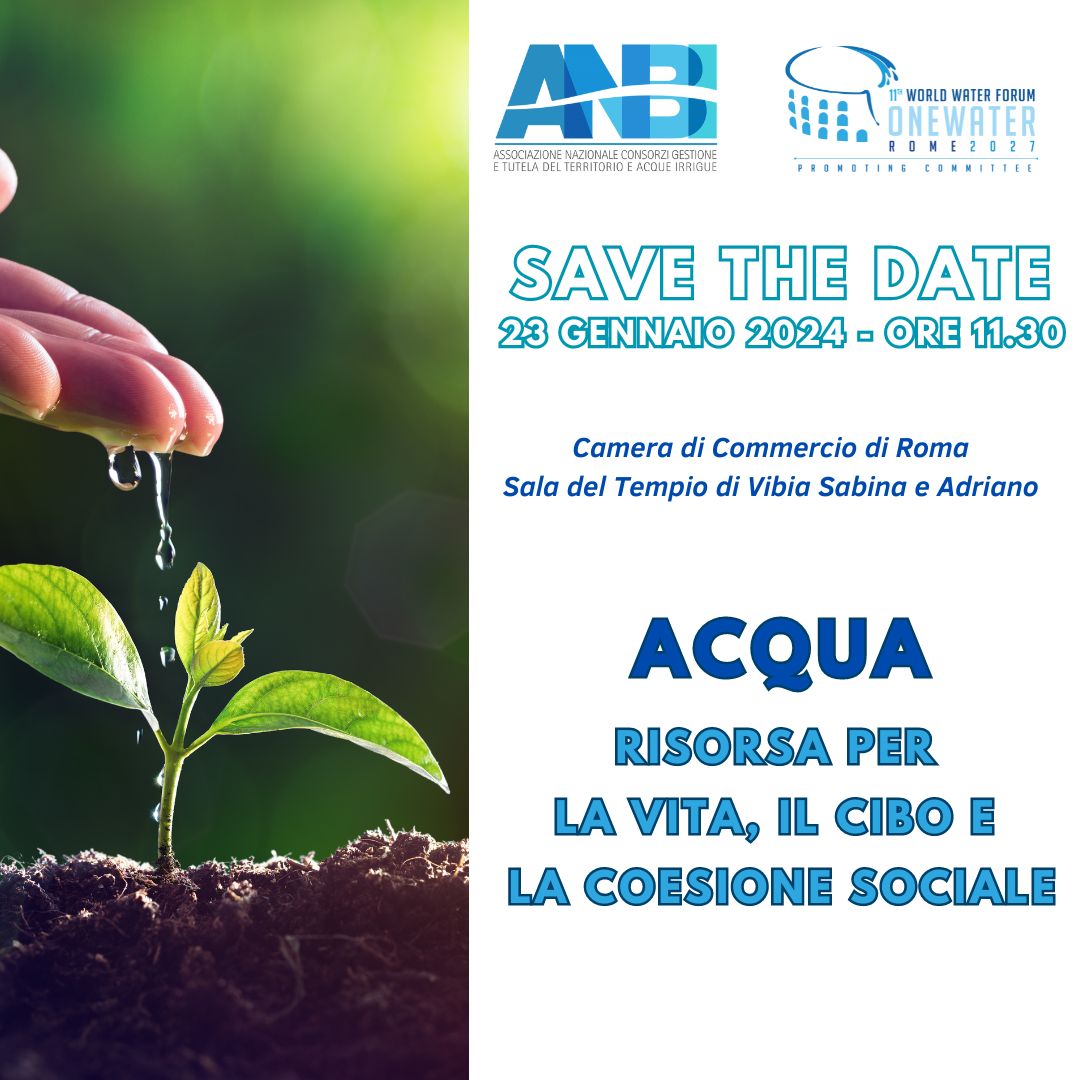Per iniziativa di ANBI, il “kick off” per l’avvio della candidatura italiana e della città di Roma a sede del Forum Mondiale dell’Acqua 2027 si terrà martedì 23 Gennaio p.v. dalle ore 11.30 nella Sala del Tempio di Vibia Sabina e Adriano della Camera di Commercio di Roma, in occasione della visita ispettiva del World Water Council.