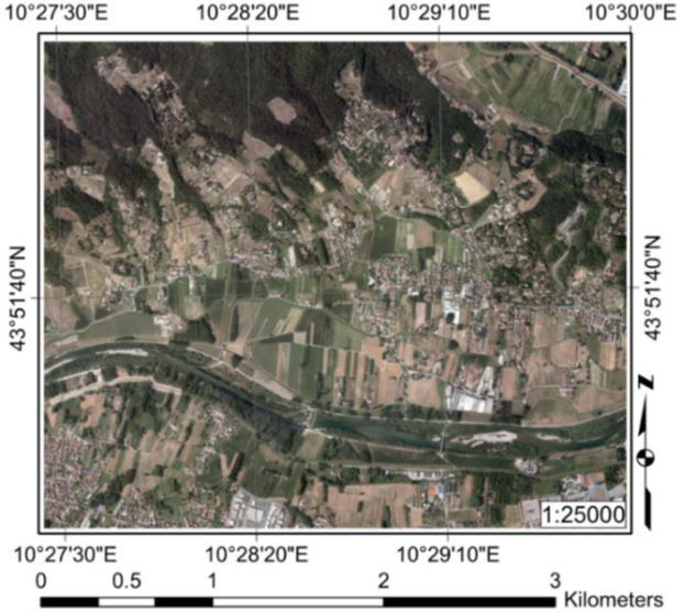 Per la calibrazione e validazione dell’algoritmo, la ricerca ha utilizzato le più recenti orto-immagini aeree ad alta risoluzione della Regione Toscana su un’area di circa trenta chilometri quadrati a Nord della città di Lucca ed attraversata dal fiume Serchio, ricompreso nel comprensorio del Consorzio di bonifica Toscana Nord, che gestisce oltre ottomila chilometri di corsi d’acqua in diverse aree urbane, suburbane e montane della zona settentrionale della regione.