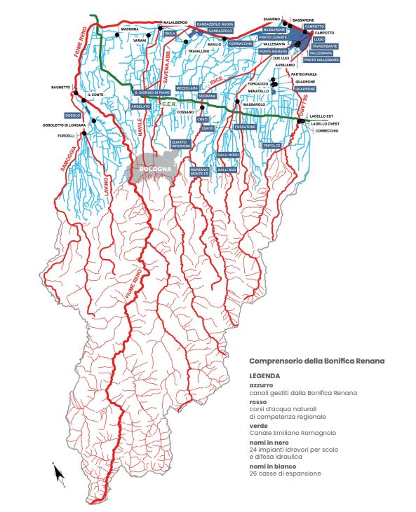 I Consorzi di bonifica, invece, sono competenti per la gestione del reticolo artificiale di scolo in pianura, costituito in Emilia Romagna da migliaia chilometri di canali artificiali e condotte, nonché decine di casse di espansione ed impianti idrovori; tale reticolo è stato gravato dalle numerose esondazioni provenienti dalle rotte e dai sormonti dei corsi d'acqua e dei torrenti regionali (a livello nazionale la rete idraulica minore per tenere asciutti i territori e gestire le acque superficiali consta di circa duecntoventimila chilometri di alvei con decine di migliaia di opere idrauliche e circa novecento centrali idrovore).