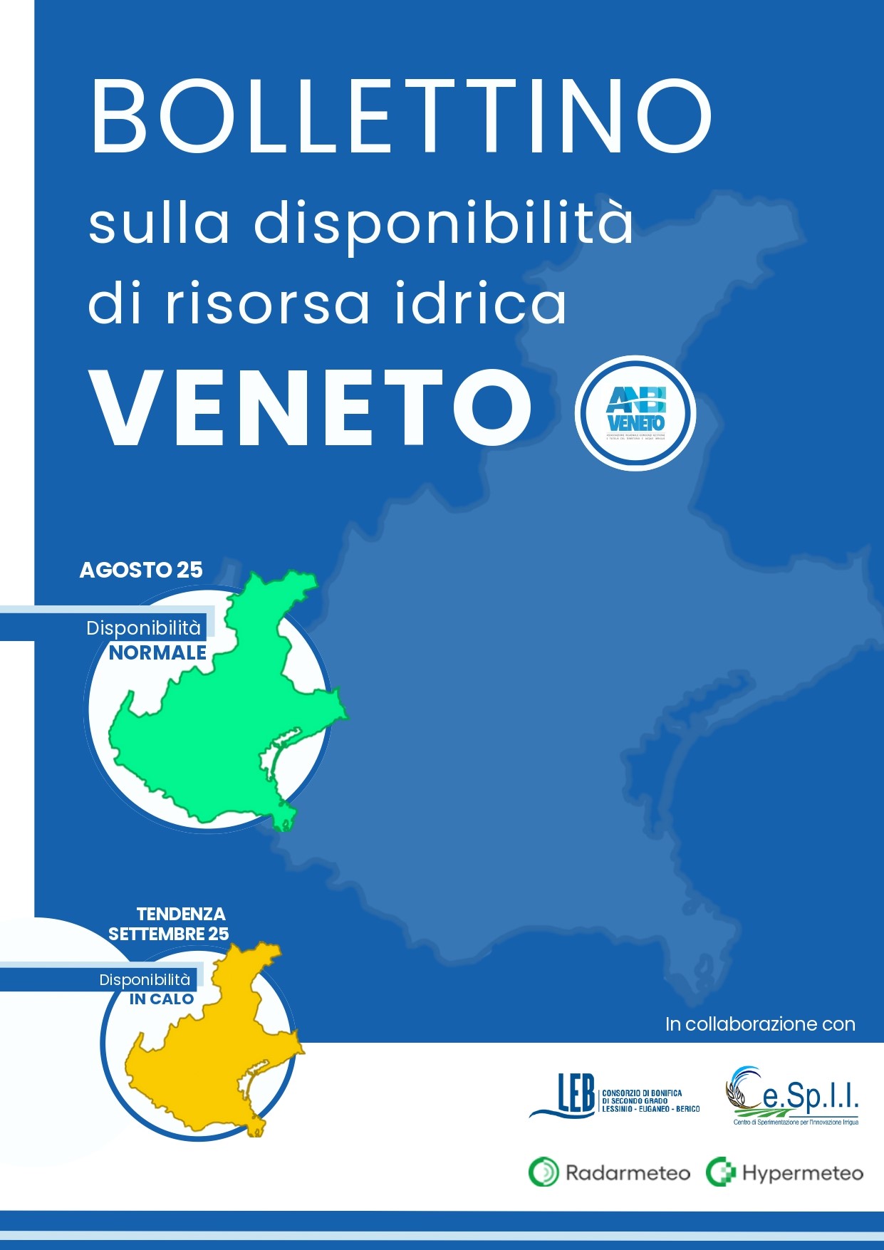 E Settembre? Secondo le previsioni del Centro Sperimentale sull’Innovazione Irrigua, istituito presso il Consorzio LEB (CeSPII-LEB, con sede a San Bonifacio, in provincia di Verona), la seconda decade del mese potrebbe registrare un’anomalia negativa delle precipitazioni nella zona Sud-Occidentale del Veneto a fronte di una situazione generalmente eterogenea, che mediamente porterà sul territorio regionale tra i 60 e i 130 millimetri di pioggia con quantità maggiori nei settori centro-settentrionali e pedemontani.