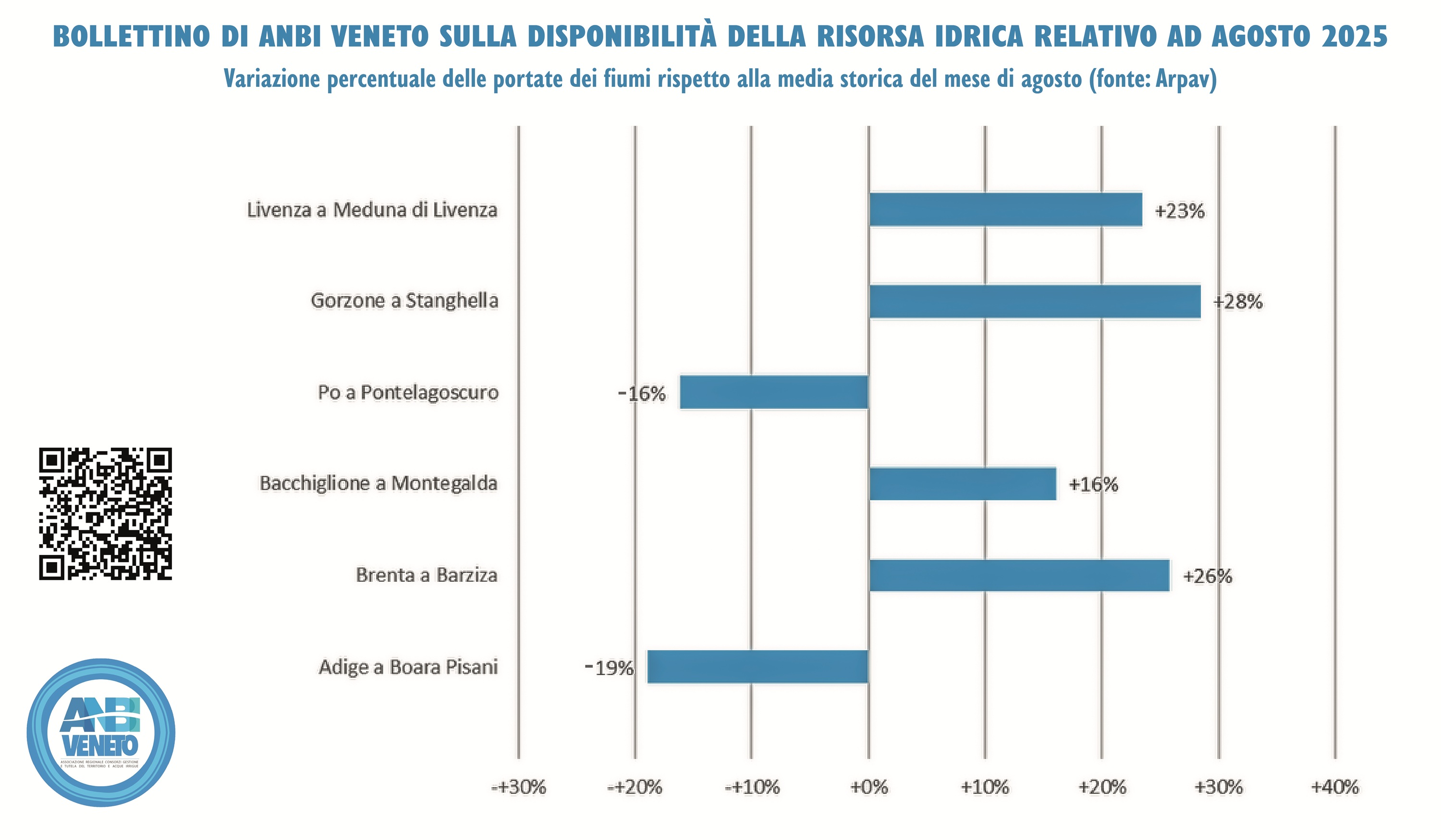 In Veneto a crescere sono le portate del fiume Bacchiglione, mentre il trend è negativo per Adige, Brenta e Livenza.