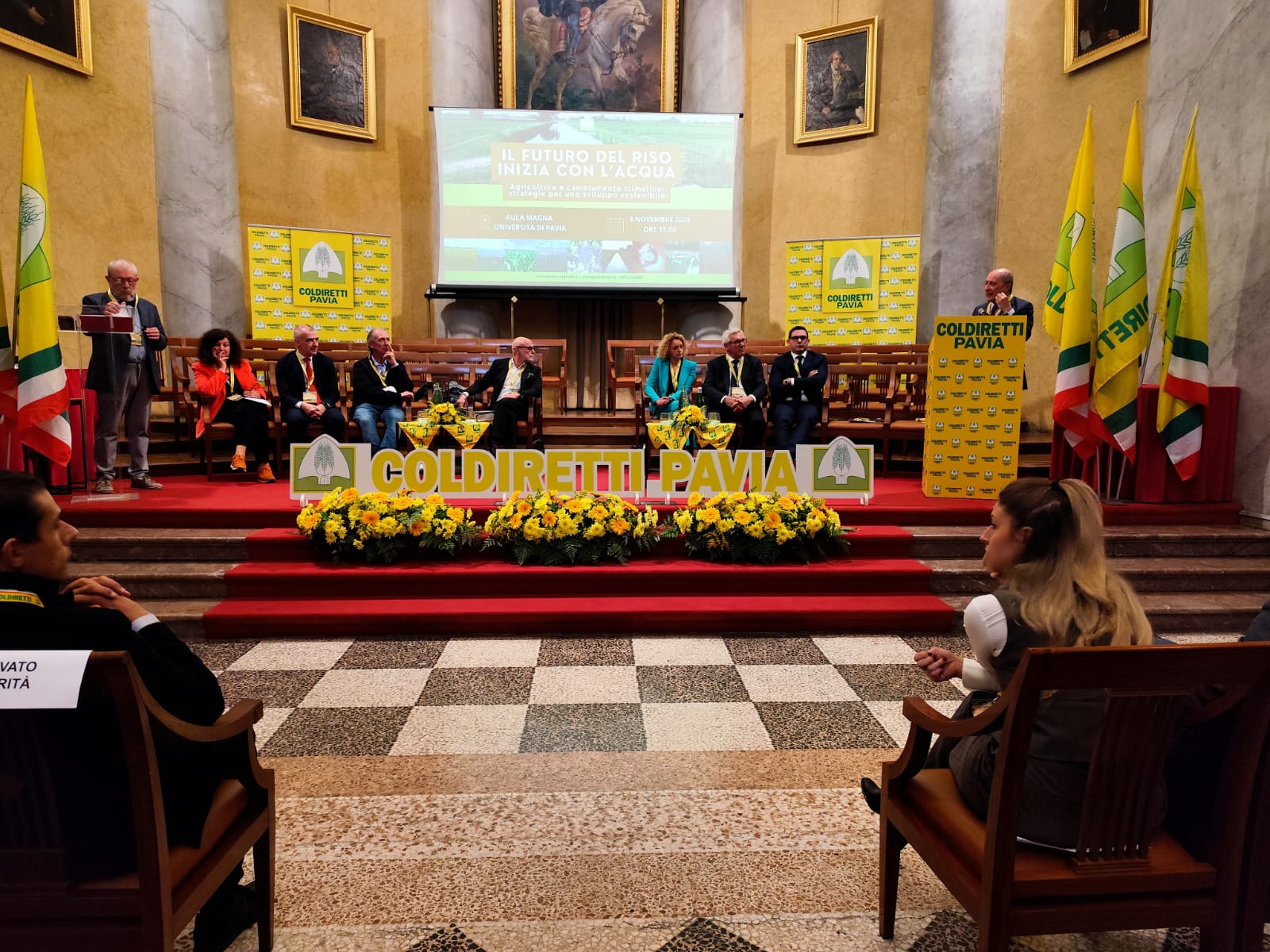 Nell'Aula Magna dell'Università di Pavia, la locale Coldiretti ha organizzato il convegno “Il futuro del riso inizia con l’acqua. Agricoltura e cambiamento climatico: strategie per uno sviluppo sostenibile”, coinvolgendo agricoltori, esperti ed Istituzioni per un confronto sulle prospettive del settore risicolo.