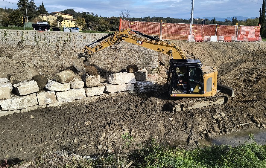 Il colpo finale è arrivato con la piena del 6 Novembre 2016, che ha provocato il crollo in alveo della massicciata di protezione. Grazie ad un finanziamento regionale di 140.000 euro, il Consorzio di bonifica 2 Alto Valdarno (con sede ad Arezzo), dopo la rimozione dei vecchi gabbioni con il recupero dei materiali idonei come riempimento, ha ricostruito la scogliera di fondazione, con massi ciclopici di grande pezzatura, intasati con calcestruzzo per garantire massima resistenza all’erosione; ha realizzato un muro in massi ciclopici squadrati, posizionati come un mosaico di pietra naturale per assicurare stabilità ed integrazione paesaggistica; infine ha creato una protezione del piede della sponda con massi provenienti dal fondo alveo.