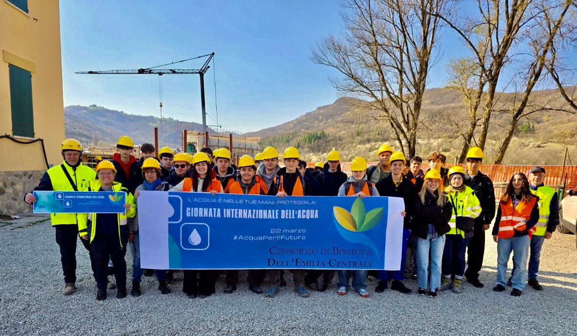 E’ in questo contesto che, in concomitanza con la celebrazione della Giornata Mondiale dell’Acqua 2026, due classi terze dell'Istituto Superiore Antonio Zanelli (48 studenti e 4 docenti del corso di studi per geometri), arrivando su rotaia da Reggio Emilia a Ciano d’Enza e proseguendo poi fino a Cerezzola, hanno potuto toccare con mano l’operato degli interventi del Consorzio di bonifica Emilia Centrale (con sede nel capoluogo reggiano), visitando il cantiere, che l’ente consortile sta via via completando in prossimità della cosiddetta traversa di Cerezzola: un macro-progetto di rifunzionalizzazione ed ammodernamento dell’infrastruttura idraulica per ridurre gli impatti ambientali, incrementare la sicurezza e garantire maggiore risorsa ed efficienza disponibile.